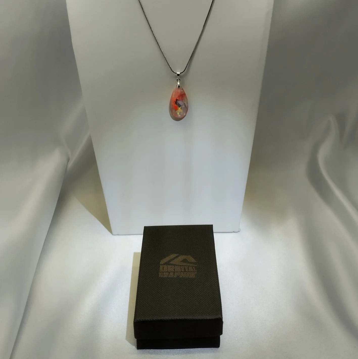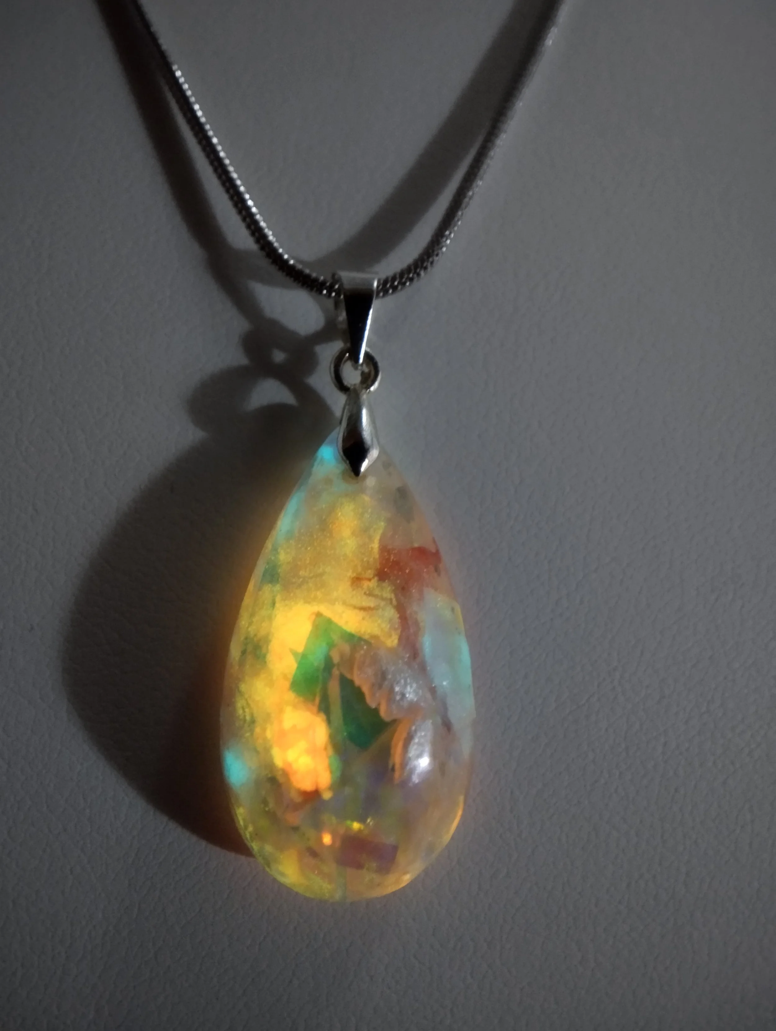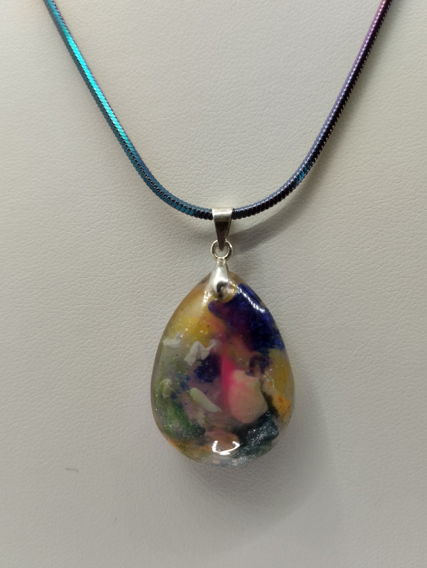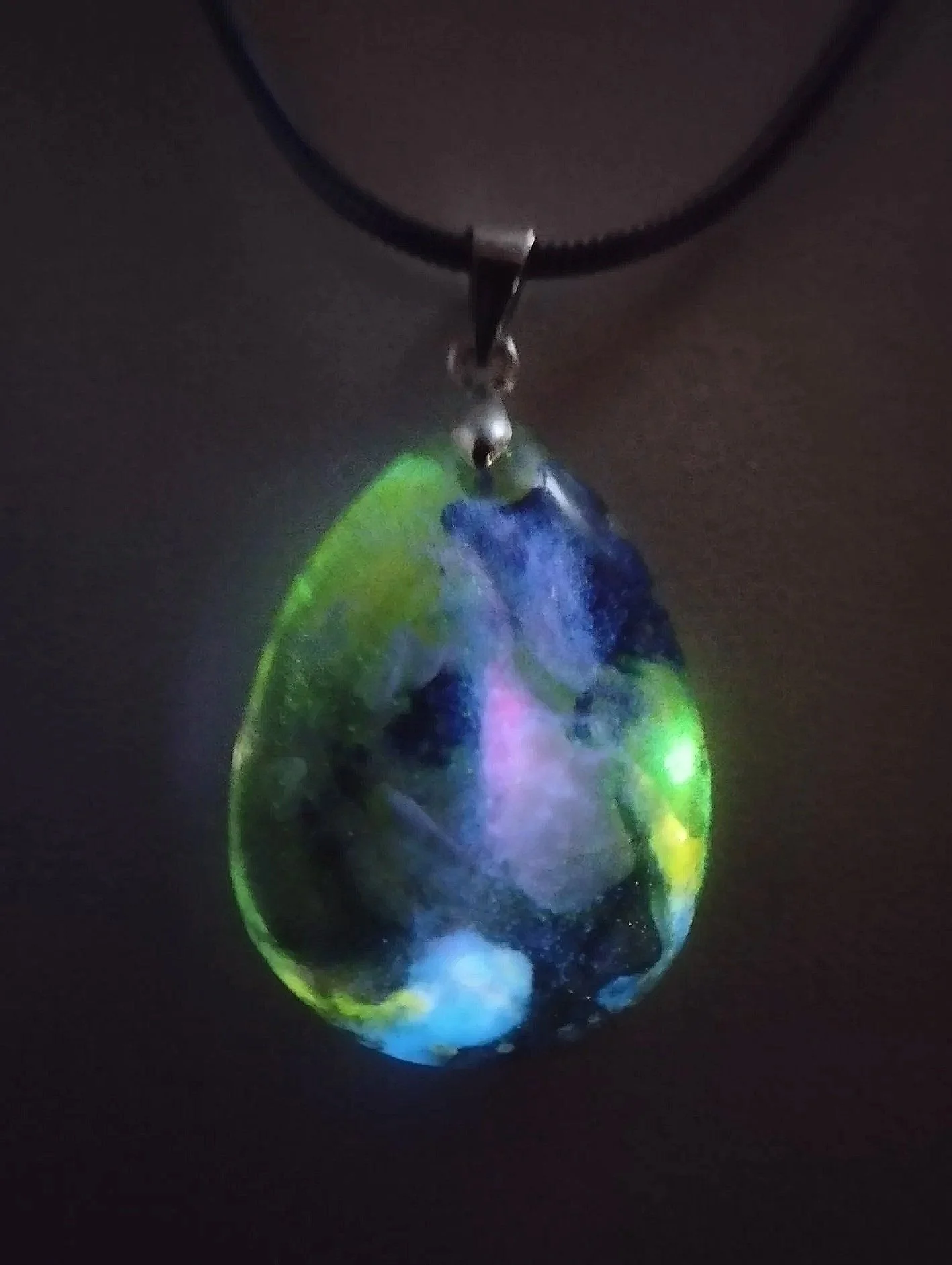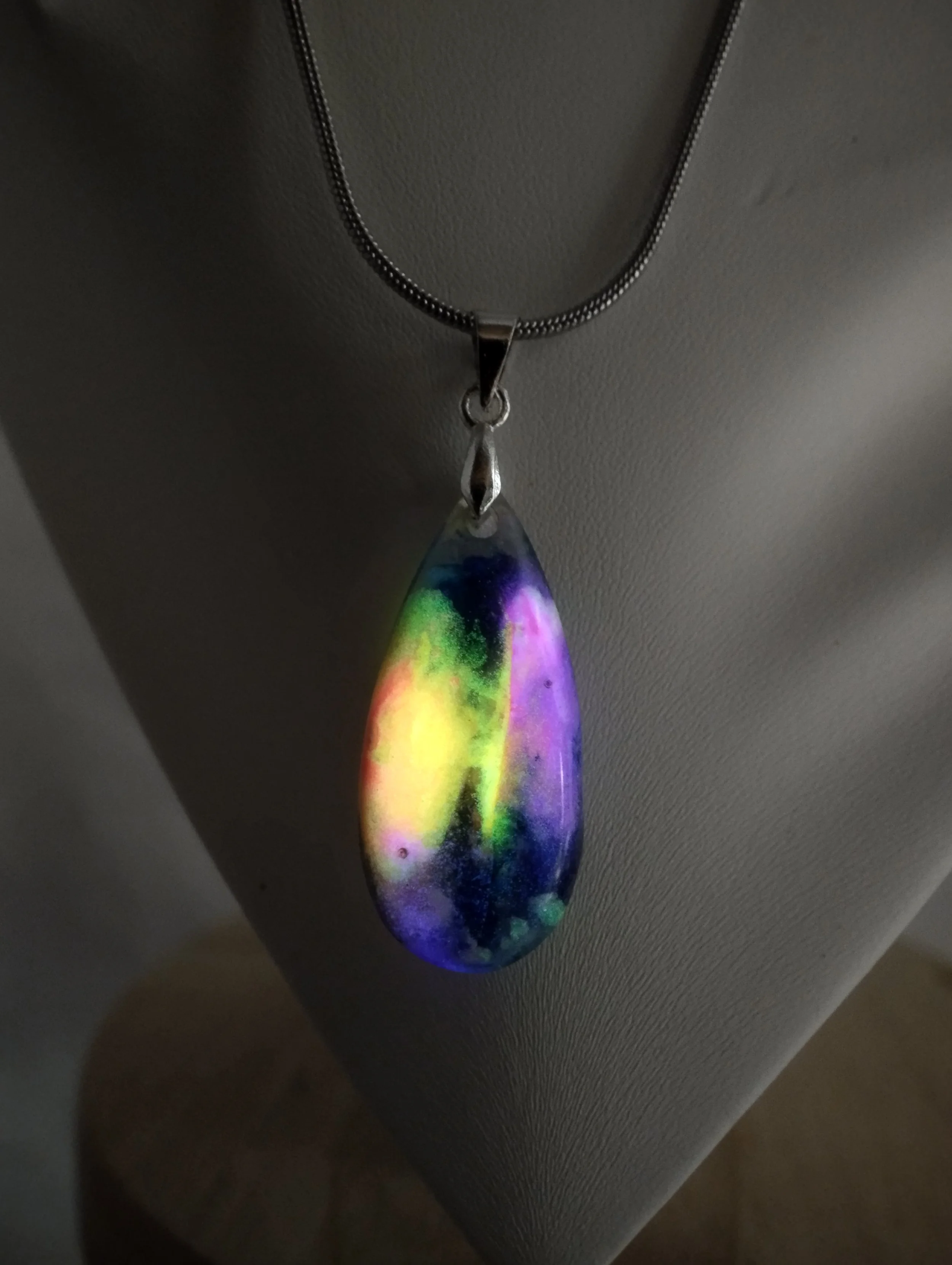 Inspiré des couleurs mouvantes des nébuleuses et des aurores polaires, ce pendentif dévoile un univers miniature. Les pigments semblent flotter comme des nuages cosmiques et s’illuminent sous UV, révélant une lumière mystérieuse digne d’un phénomène céleste.